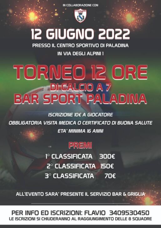 Grande appuntamento sabato 12 giugno a Paladina con il “Torneo 12 ore Bar Sport Paladina” di calcio a 7. L’evento, che si terrà presso il Centro Sportivo di via degli Alpini, prevede un montepremi di 300 euro per la prima classificata, 150 per la seconda e 70 euro per la terza classificata.