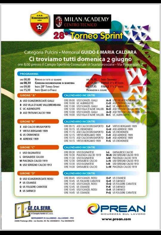 Il 28° Torneo Sprint dedicato ai Pulcini (Memorial G.M. Caldara) si svolgerà domenica 2 giugno a Scanzorosciate, impegnando l’intera giornata. Come sempre molto qualificata la rappresentanza delle squadre: Scanzo, AlbinoLeffe, Villa Valle, Brusaporto, Cremonese, Virtus Bergamo, Olginatese, Piacenza, Ghisalbese, Folgore, Cisanese, Sarnico, Tritium, Adrense, Seregno. Ecco il programma: