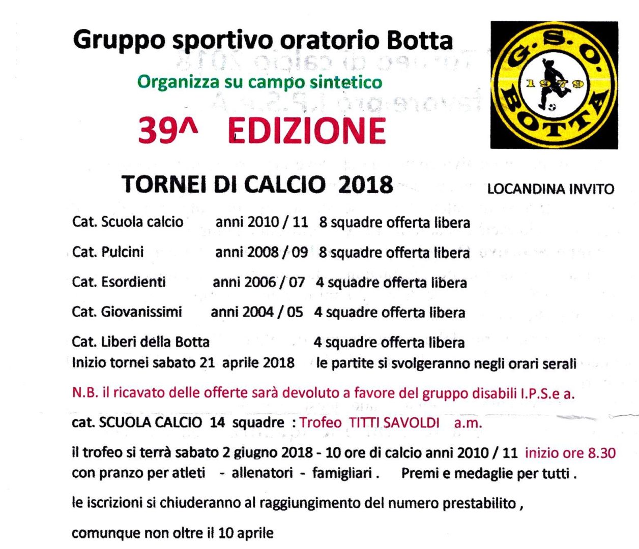 Il Gruppo Sportivo Oratorio Botta di Sedrina organizza il 39° Torneo di calcio 2018, che si concluderà sabato 2 giugno (Trofeo Titti Savoldi a.m.) su campo sintetico.
