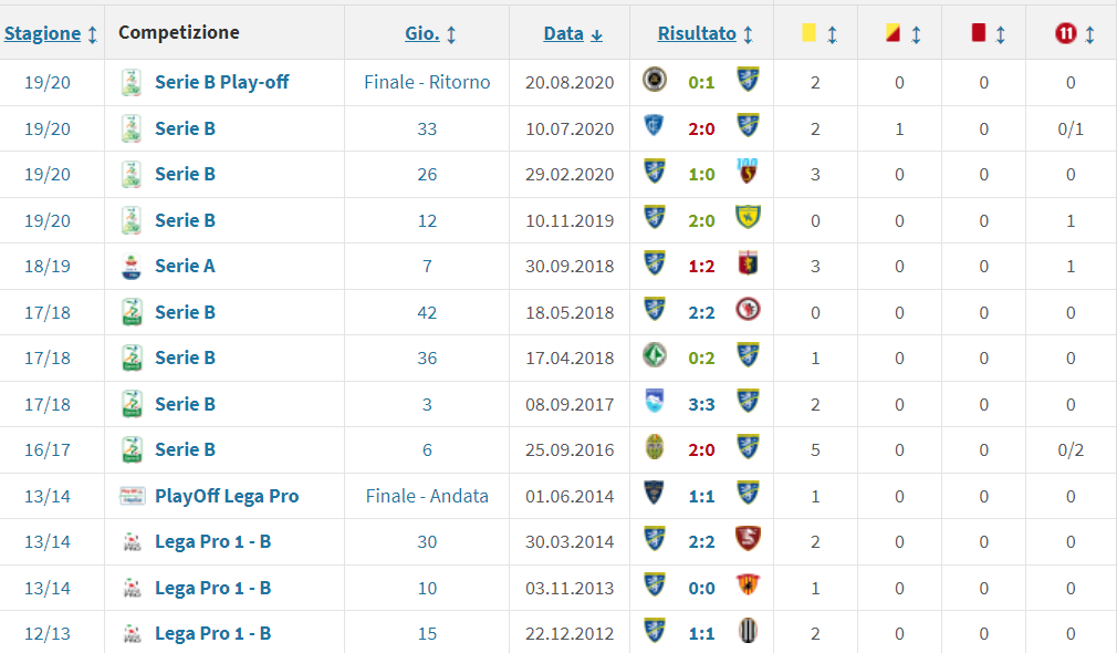 Adesso, sabato 26 agosto (18.30) al “Benito Stirpe”, la settima gara su otto fuori casa arbitrata. Gli assistenti saranno Niccolò Pagliardini di Arezzo e Giuseppe Perrotti di Campobasso, il quarto ufficiale Alberto Santoro di Messina, V.A.R. Federico Dionisi di L’Aquila, A.V.A.R. Matteo Gariglio di Pinerolo. I precedenti col Frosinone padrone di casa sono quasi il doppio, 13, comprensivi di 4 “3 punti”, 6 pari e 3 ko. Ma l’ultima volta è abbastanza remota, il corto muso a La Spezia in serie B il 20 agosto di 3 anni fa. Nella tabella di Transfermarkt, il riepilogo.