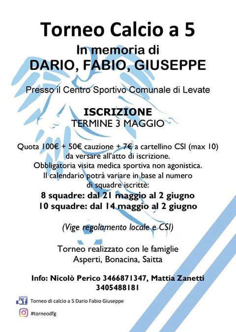 Torna a Levate il torneo di calcio a 5 organizzato in memoria di Dario Bonacina, Fabio Asperti e Giuseppe Saitta, tre ragazzi del paese che persero la vita in un incidente stradale e che i loro amici, in collaborazione con le famiglie Asperti, Bonacina e Saitta vogliono ricordare con questa manifestazione che ormai è diventata un’istituzione in paese (siamo alla quarta edizione). A seconda del numero di squadre iscritte (termine iscrizione il 3 maggio), il torneo comincerà il 14 o il 21 maggio, per concludersi poi il 2 giugno.