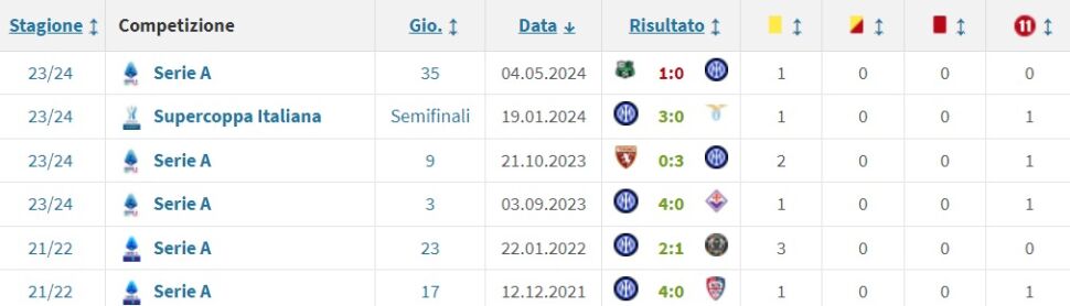 Era il 20 agosto 2023 e, curiosamente, proprio nella stessa annata e proprio in casa dei neroverdi, poi retrocessi, cade anche l’ultimo dei sei precedenti del fischietto ostiense con la Beneamata campionessa d’Italia: 4 maggio 2024, al ventesimo la risolve Laurienté, in panchina Ballardini succeduto a Dionisi che aveva a sua volta sostituito Dionisi. L’unico scivolone dell’Inter con Marchetti, perché per il resto ci ha sempre vinto, in casa con Cagliari, Venezia e Fiorentina, fuori col Torino e infine nella semifinale di Supercoppa Italiana dagli sceicchi contro la Lazio. Ben 4 i rigori a favore, come si può desumere dallo screenshot da Transfermarkt.