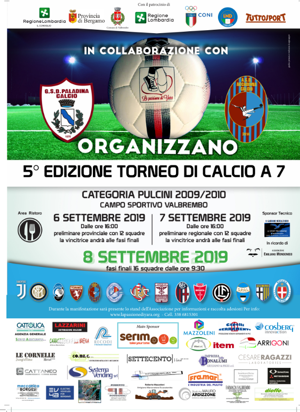La Passione di Yara Onlus organizza la quinta edizione del Torneo di Calcio “La Passione di Yara” in collaborazione con l’Accademia Calcio del presidente Walter Mazzoleni e il Paladina Calcio del presidente Egidio Capitanio. Come sempre numerosi volontari permetteranno di vivere tre giorni intensi di sport che coinvolgeranno più di 600 ragazzi.