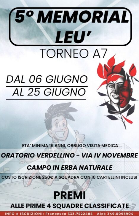E’ cominciato a Verdellino il “Memorial Leù”, nel ricordo di Leonardo Scarpellini, ragazzo che ci ha lasciato troppo presto per un incidente sul lavoro. Quella di quest’anno è la quinta edizione, già avviata martedì 6 giugno e che continuerà fino al 25. Quest’anno gli organizzatori, nonché ex compagni di squadra di Leo al Sabbio, Francesco Romei, Alex Viganò, Andrea Fantoni, Gennaro Palma e Valerio Scarpellini, hanno optato per diminuire il numero di squadre partecipanti, infatti, saranno 8, ossia le storiche che fin da subito hanno partecipato al torneo. La formula sarà: due gironi all’italiana con semifinali e finali. Le prime quattro squadre saranno premiate dalla Volvo con delle coppe e ci saranno anche premi individuali come “Capo Cannoniere”, “Miglior Giocatore”, “Miglior Portiere” e il premio fair play. Il torneo si svolgerà interamente all’Oratorio di Verdellino, che grazie alla concessione sua e dell’OVZ, rende possibile la disputa del memorial, inoltre, giovedì 15 e tutti i venerdì sarà attivo il servizio di ristorazione alla festa dell’oratorio, oltreché la domenica delle finali. Tutte le info aggiuntive nella locandina sotto.