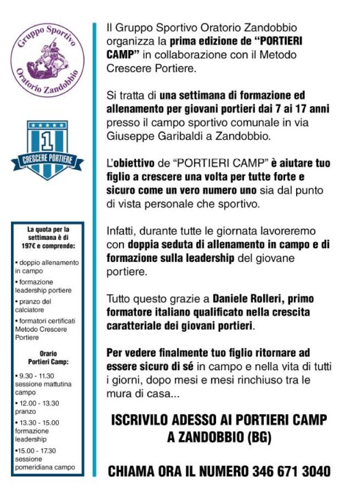 Grande appuntamento a Zandobbio, dove dal 5 al 9 luglio si svolgerà il “Portieri Camp” organizzato dal Gruppo Sportivo Oratorio Zandobbio in collaborazione con il metodo “Crescere Portiere”.