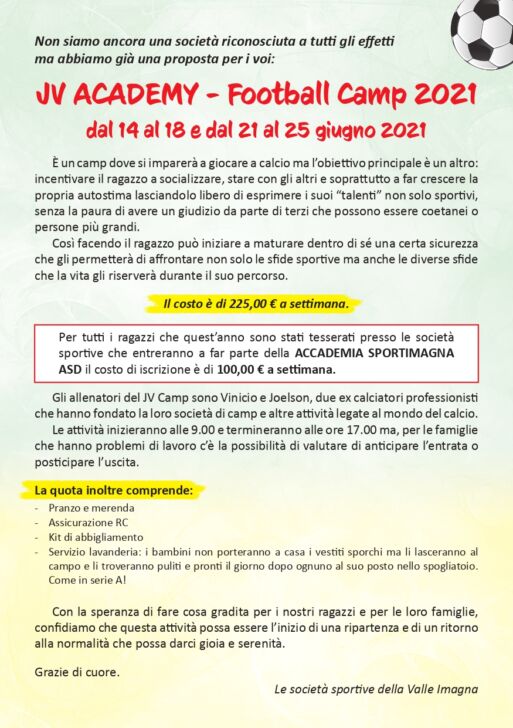 Gli allenatori del JV Camp sono Vinicio e Joelson, due ex calciatori professionisti che hanno fondato la loro società di camp e altre attività legate al mondo del calcio. Le attività inizieranno alle 9.00 e termineranno alle ore 17.00 ma, per le famiglie che hanno problemi di lavoro c’è la possibilità di valutare di anticipare l’entrata o posticipare l’uscita. La quota inoltre comprende: – Pranzo e merenda – Assicurazione RC – Kit di abbigliamento – Servizio lavanderia: i bambini non porteranno a casa i vestiti sporchi ma li lasceranno al campo e li troveranno puliti e pronti il giorno dopo ognuno al suo posto nello spogliatoio. Come in serie A! Con la speranza di fare cosa gradita per i nostri ragazzi e per le loro famiglie, confi diamo che questa atti vità possa essere l’inizio di una ripartenza e di un ritorno alla normalità che possa darci gioia e serenità. Grazie di cuore.