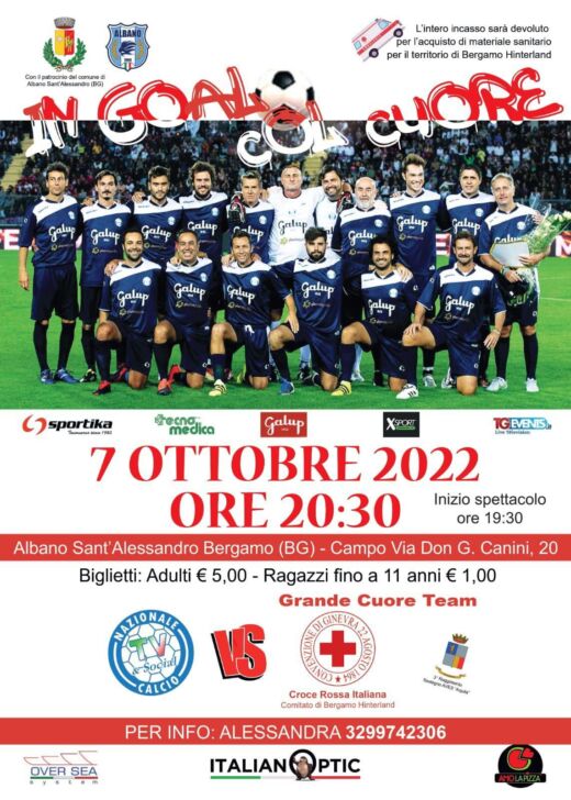 Venerdì 7 ottobre ad Albano Sant’Alessandro si gioca la partita Nazionale Calcio TV & Events vs Croce Rossa. La finalità della manifestazione è benefica, con l’obiettivo di raccogliere fondi per l’acquisto di una nuova ambulanza per il comitato Bergamo Hinterland.