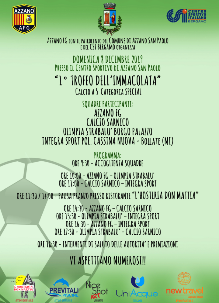 Domenica 8 dicembre la società sportiva dell’Azzano FG organizza, in collaborazione e con il patrocinio del Comune di Azzano San Paolo e del CSI Bergamo, il “1° TROFEO DELL’IMMACOLATA” riservato ai ragazzi del Calcio a 5 Special.