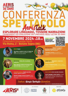 L’AERIS TALK funziona come una vera e propria conferenza-spettacolo, in cui sei ospiti hanno la possibilità di prendere parola e costruire il proprio discorso per un tempo massimo di 15 minuti ciascuno, usando gli stili di comunicazione che più preferiscono. Si passerà quindi dal semplice storytelling arrivando persino alla performance teatrale e all’inclusione musicale. La durata sarà di circa un paio d’ore, e il tutto terminerà con un buffet e un brindisi offerti per festeggiare il trentennale di Aeris.