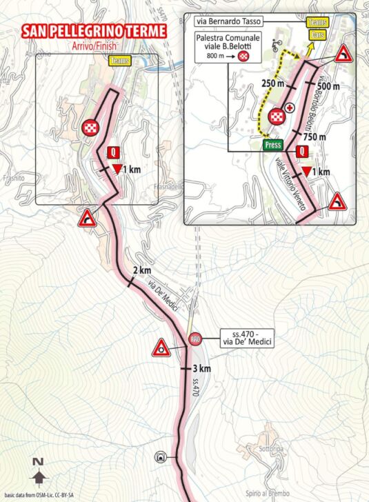 La sesta tappa di martedì 8 giugno vedrà, infine, l’arrivo nell’orobica San Pellegrino Terme dopo 176 chilometri con partenza da Bonferraro di Sorgà, in provincia di Verona alle ore 12:25. L’ingresso nella provincia di Bergamo della carovana rosa sarà alle 14:49 con il transito da Pumenengo per toccare poi i comuni di Calcio, Cividate al Piano, Mornico, Bolgare, Montello, Albano Sant’Alessandro, Gavarno-Tribulina, Nembro, San Vito e l’ingresso a Selvino è per le 15:58 quando i giovani ciclisti transiteranno su via S. Patrioti lanciati verso il traguardo di via San Carlo, in centro alla città termale. A decidere le sorti di questa tappa in terra bergamasca sarà la salita di Selvino che, posta a venti chilometri dal traguardo, spezzerà il ritmo dei corridori pronti a lanciarsi nella discesa finale. Marco Selleri, presidente di Nuova Ciclistica Placci 2013 su questa tappa: “E’ la tappa più lunga del Giro, con un percorso principalmente pianeggiante. Decisivo sarà il “Gran Premio della Montagna” (GPM) di Selvino, spesso affrontato dai professionisti in quanto crocevia per diverse salite della zona. E’ una scalata pedalabile e per questo motivo potrebbe arrivare un gruppetto”.