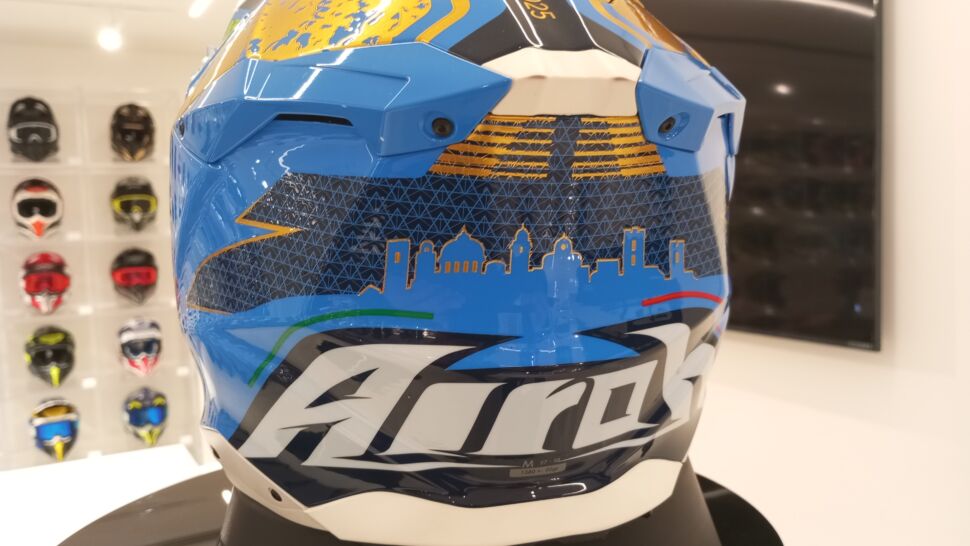 Quando un casco è figlio della lunga passione di famiglia: “Lo speciale per la 6 Giorni di enduro bergamasca tra il 24 e il 29 agosto cade nel decimo anniversario della partnership con la Federazione Internazionale di Motociclismo. Si tratta di un Aviator III a tiratura limitata, 200 esemplari in tutto il mondo, con la skyline di Bergamo Alta e il profilo stilizzato che richiama le montagne delle nostre valli”, spiega Martina Locatelli, Chief of Operation Officer di Airoh, acronomo per Antonio Innovation Range of Helmet. “Un casco leggero, con calotta in fibra di carbonio e rivestimento in tessuto traspirante che il nostro servizio corse, presente con un truck e kit dedicati a ogni competizione, alla Sei Giorni in particolare, lava e ricondiziona sostituendone l’interno a ogni manche. Il cinque volte campione del mondo Josep Garcia, Andrea Verona e Samuele Bernardini, insieme a Nathan Watson e alla squadra francese, sono i nostri piloti ufficiali, i nostri testimonial e anche i nostri principali influencer: lo sviluppo del prodotto, infatti, è determinato dalle esigenze di gara, dai feedback dei nostri atleti, per cui il racing service e l’ufficio prodotto lavorano a stretto contatto”, precisa Martina, secondogenita di Antonio, affiancata dalla sorella maggiore Angela che posa per la foto insieme ai figli Camilla, Matilde e Cesare Maria.