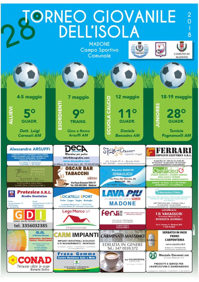 Al via a Madone, organizzato dalla Polisportiva, il tradizionale Torneo giovanile dell’Isola. Quattro le categorie di squadre giovanili coinvolte: