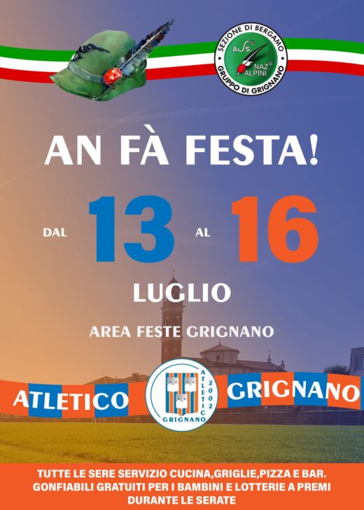 Dal 13 al 16 luglio al via la festa degli alpini a Grignano. Il tutto si terrà nell’area feste di della frazione di Brembate, tutto sotto il patrocinio, ovviamente, dell’Atletico Grignano. Durante le serate disponibile il servizio cucina e non solo, con tante attività per grandi e piccoli. Tutte le info nella locandina: