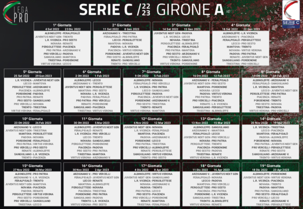 Proprio nella tana dei Cannibali, il 14 prossimo salvo anticipi e posticipi, il primo di cinque turni infrasettimanali. Gli altri saranno il 19 ottobre con l’Arzignano Valchiampo neopromosso, il 30 novembre a Mantova, il 1° febbraio a Lecco e il 15 marzo a San Giuliano Milanese contro un’altra cenerentola, l’ambizioso Sangiuliano City. Al “Bottecchia” di Pordenone, domenica 23 aprile, la chiusura della regular season.