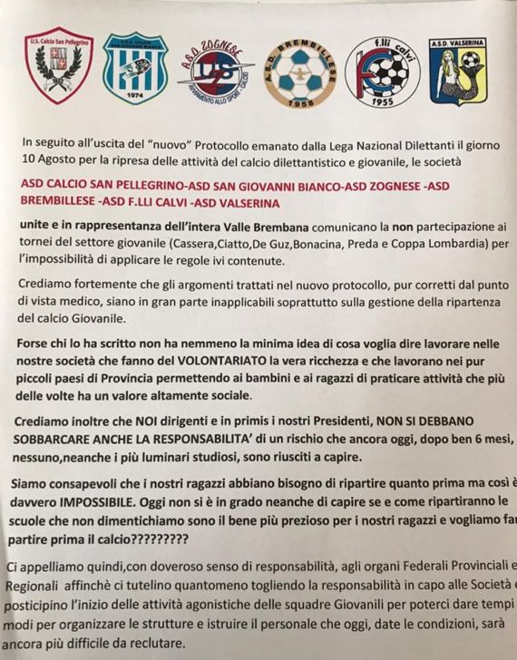 Sulla linea del Comunicato di Paladina e Accademia Calcio ( leggilo qui) anche le società della Val Brembana (Zognese, San Pellegrino, San Giovanni Bianco, Brembillese, Valserina e Fratelli Calvi di Piazza Brembana) comunicano di non iscrivere le squadre ai tornei giovanili e chiedono cambiamenti del protocollo specie per ciò che riguarda le responsabilità dei presidenti e delle società.