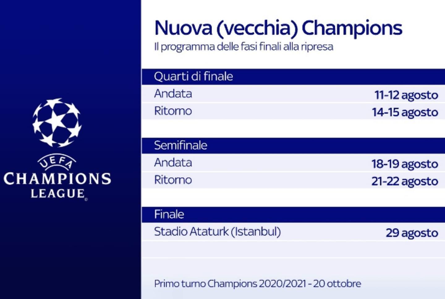 Quarti di finale (presumibilmente a porte chiuse nelle città delle squadre per cui per l’Atalanta a Milano) tra l’11 e il 15, con 72 ore tra un match e l’altro, semifinali tra il 18 e il 22, finalissima all’Ataturk di Istanbul il 29.