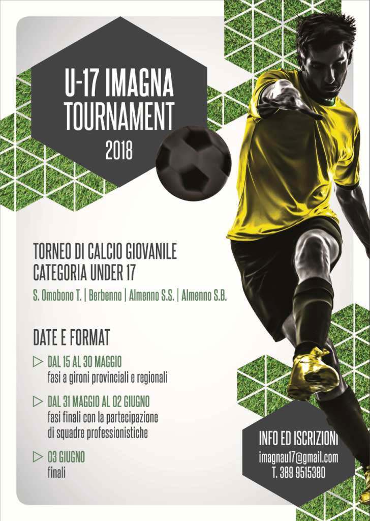 Quattro campi della Valle Imagna (S.Omobono, Berbenno, Almenno San Salvatore e Almenno San Bartolomeo) saranno coinvolti nel torneo di calcio giovanile “U-17 Imagna Tournament 2018”. La fase a gironi sarà dal 15 al 30 maggio. Le finali dal 31 maggio al 3 giugno con la partecipazione di squadre professionistiche.