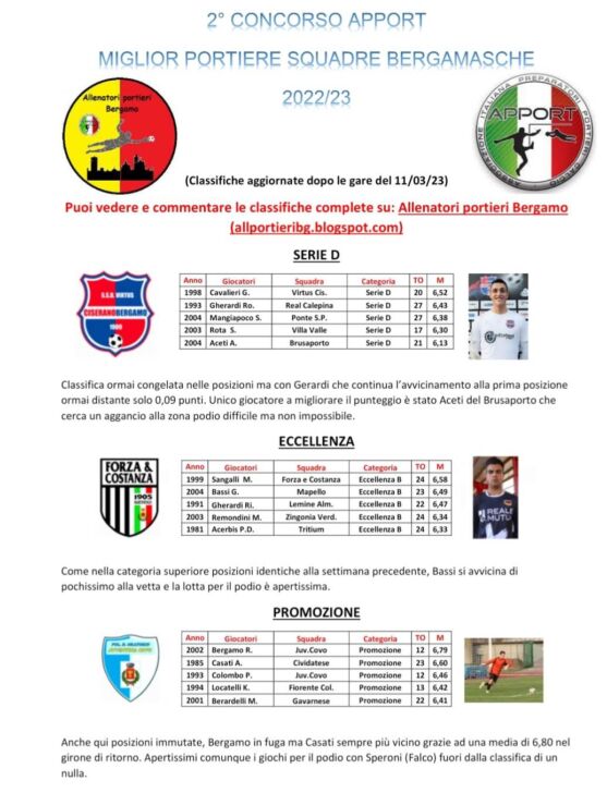 Di seguito le classifiche aggiornate al 12 marzo del “2° concorso Apport, Associazione Italiana Preparatori Portieri Calcio”, per il miglior portiere bergamasco 2022-2023: