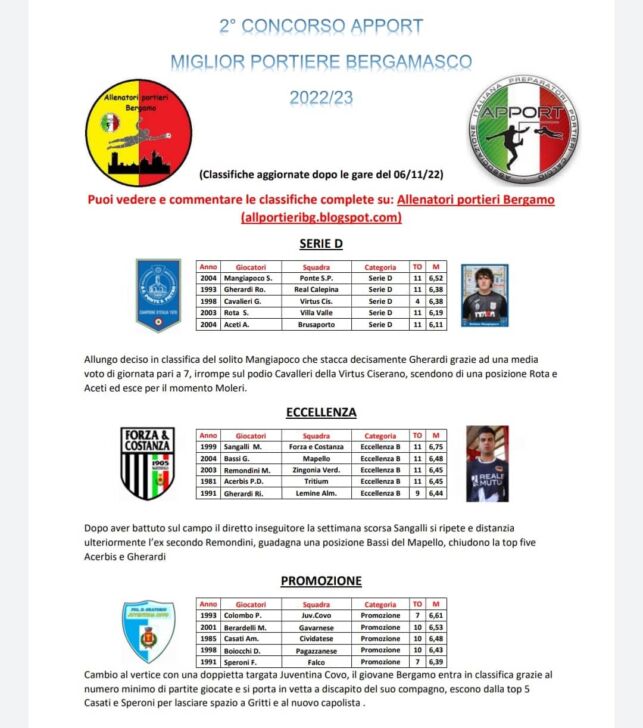 Di seguito le classifiche aggiornate al 13 novembre del “2° concorso Apport, Associazione Italiana Preparatori Portieri Calcio”, per il miglior portiere bergamasco 2022-2023: