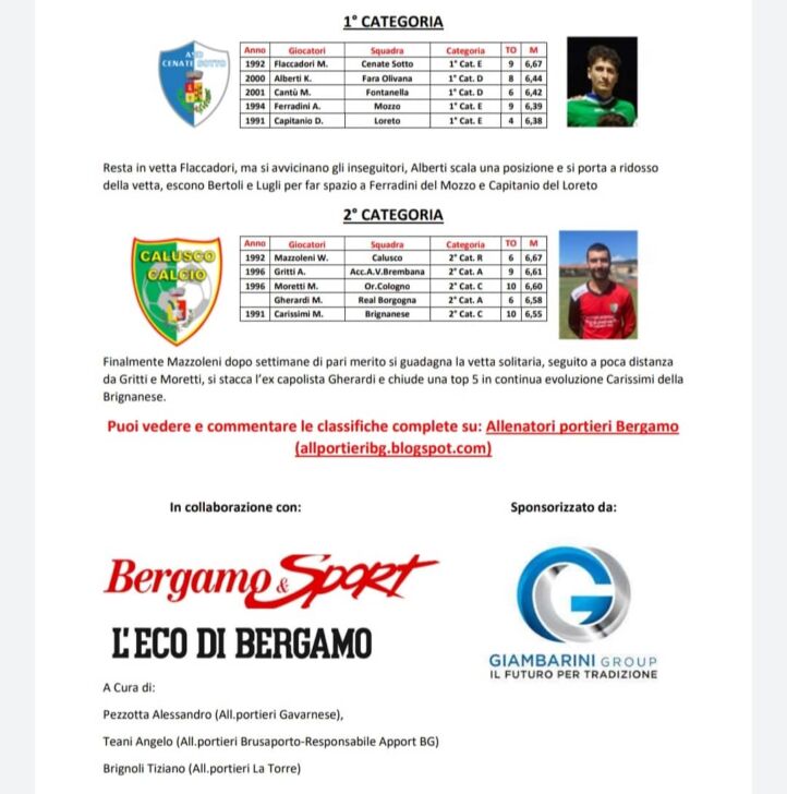 Apport, la classifica dei migliori portieri bergamaschi aggiornata al 13 novembre
