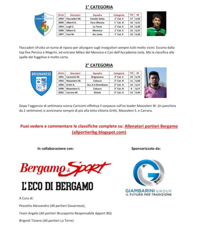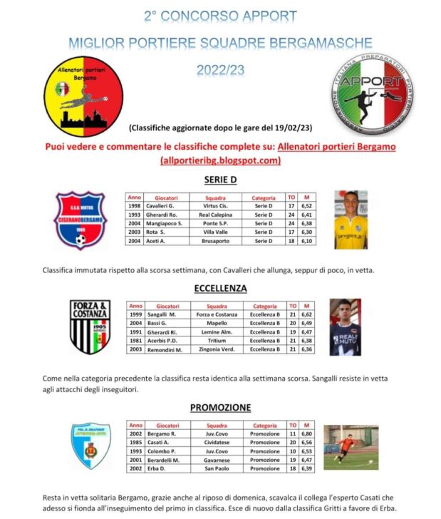 Di seguito le classifiche aggiornate al 19 febbraio del “2° concorso Apport, Associazione Italiana Preparatori Portieri Calcio”, per il miglior portiere bergamasco 2022-2023: