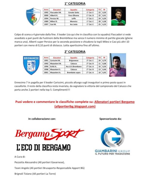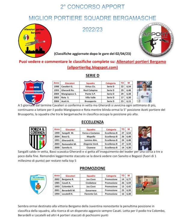 Di seguito le classifiche aggiornate al 2 aprile del “2° concorso Apport, Associazione Italiana Preparatori Portieri Calcio”, per il miglior portiere bergamasco 2022-2023:
