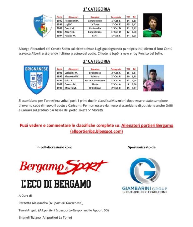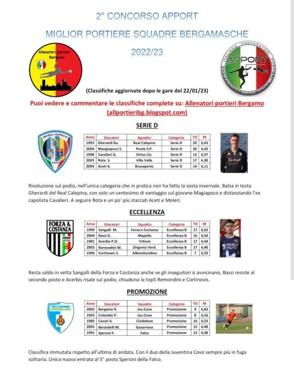 Di seguito le classifiche aggiornate al 22 gennaio del “2° concorso Apport, Associazione Italiana Preparatori Portieri Calcio”, per il miglior portiere bergamasco 2022-2023: