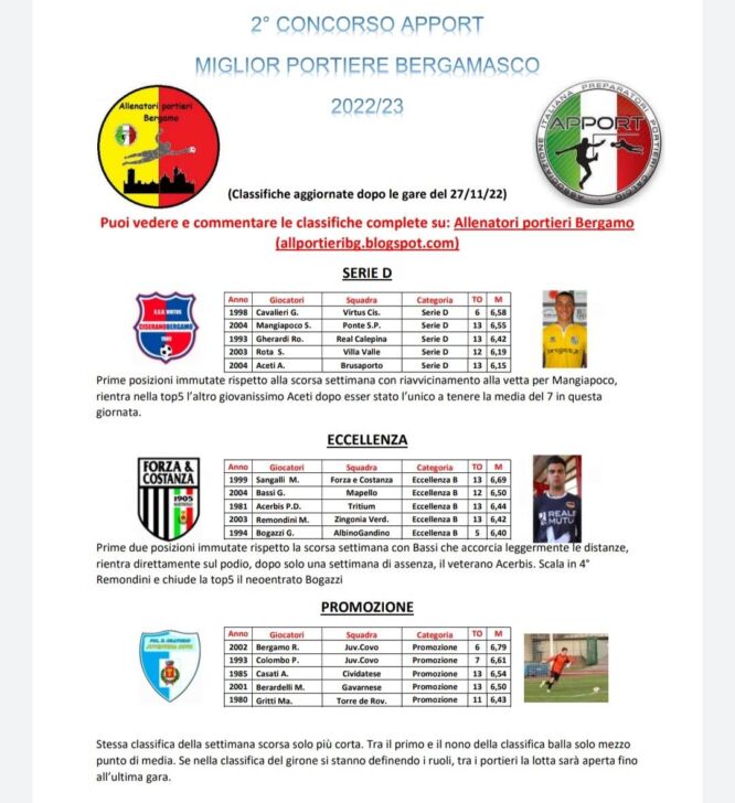 Di seguito le classifiche aggiornate al 27 novembre del “2° concorso Apport, Associazione Italiana Preparatori Portieri Calcio”, per il miglior portiere bergamasco 2022-2023: