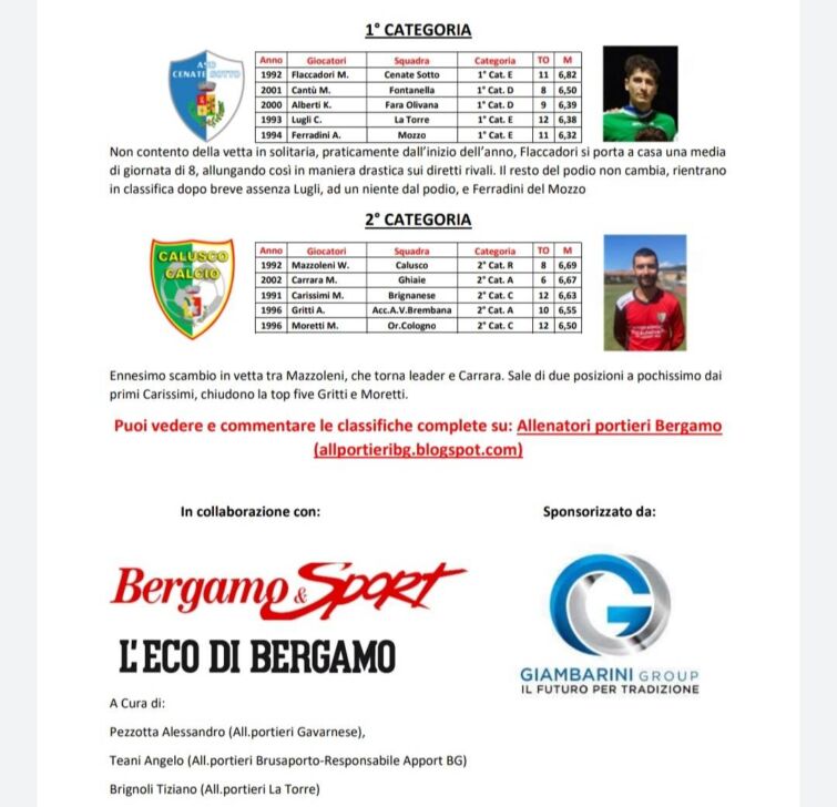 Apport, la classifica dei migliori portieri bergamaschi aggiornata al 27 novembre