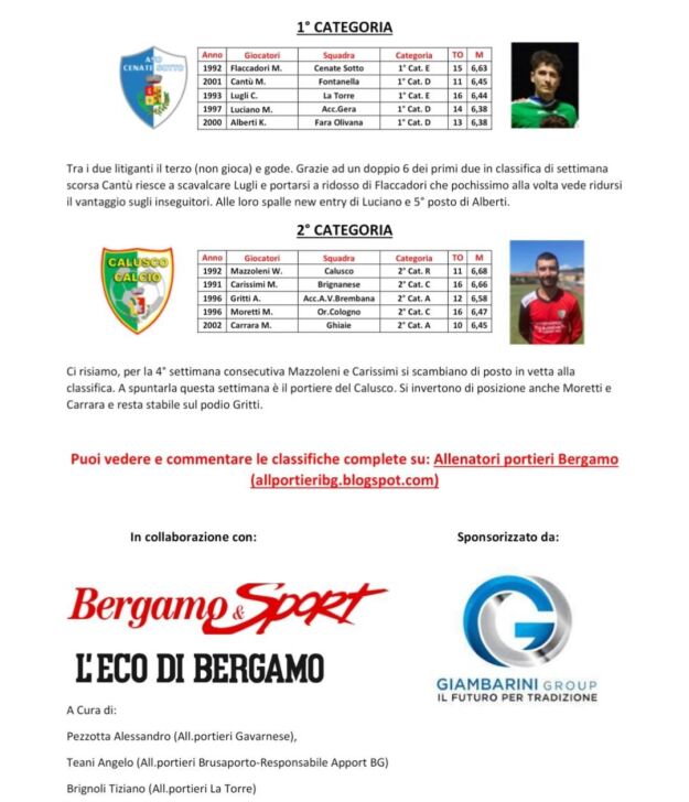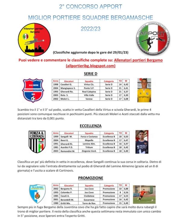 Di seguito le classifiche aggiornate al 29 gennaio del “2° concorso Apport, Associazione Italiana Preparatori Portieri Calcio”, per il miglior portiere bergamasco 2022-2023: