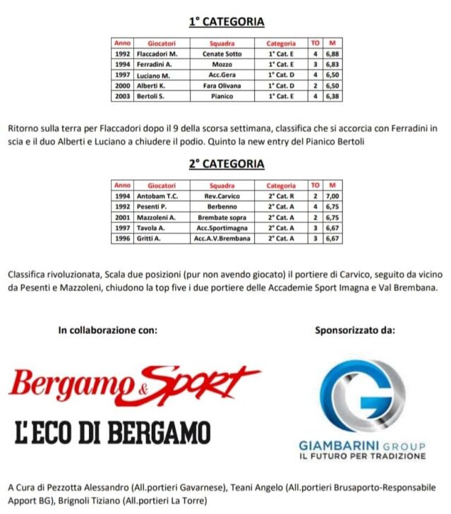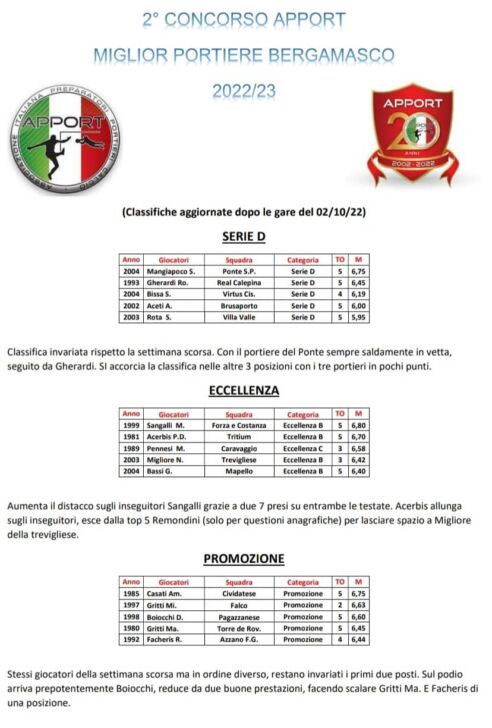 Di seguito le classifiche aggiornate al 2 ottobre del “2° concorso Apport, Associazione Italiana Preparatori Portieri Calcio”, per il miglior portiere bergamasco 2022-2023: