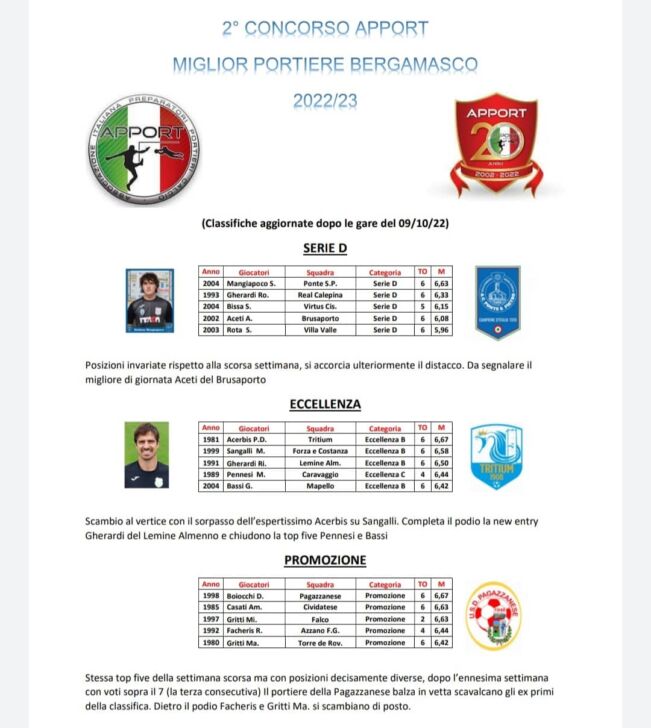 Apport, la classifica dei portieri bergamaschi aggiornata al 9 ottobre 12 Ottobre, 2022 Di seguito le classifiche aggiornate al 9 ottobre del “2° concorso Apport, Associazione Italiana Preparatori Portieri Calcio”, per il miglior portiere bergamasco 2022-2023: