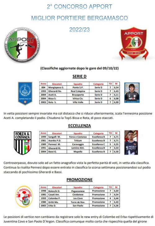 Di seguito le classifiche aggiornate al 16 ottobre del “2° concorso Apport, Associazione Italiana Preparatori Portieri Calcio”, per il miglior portiere bergamasco 2022-2023: