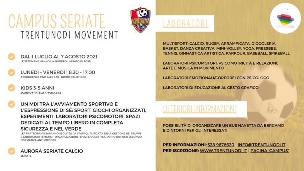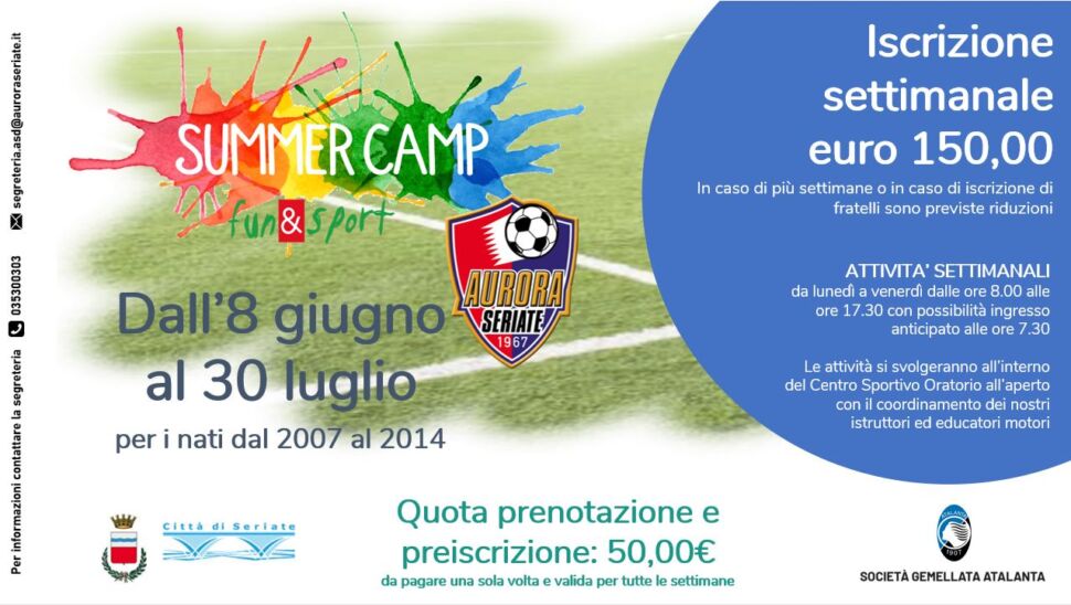 L’Aurora Seriate presenta le tre proposte estive per i più giovani che caratterizzeranno la stagione calda 2021. Di seguito tutti i volantini con le informazioni necessarie per le iscrizioni e non solo: