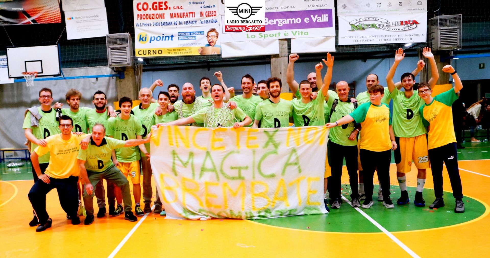 Brembate Sopra – In un Palazzetto gremito, stracolmo di tifo e passione, il Brembate Sopra tocca il cielo con un dito assicurandosi uno storico salto in Serie D, al termine di una cavalcata trionfale vissuta lungo i playoff di Promozione. Dopo due turni superati a spese di Burago di Molgora e Sanfru, la serie finale vinta per 2-0 contro il Cavenago Brianza ha decretato il verdetto più atteso, legittimando il lavoro intrapreso nell’ultimo quinquennio. Cuore, attenzione al vivaio e tanta organizzazione i tratti salienti dell’opera compiuta dal sodalizio presieduto da Dino Bellini: il Brembate Sopra è a tutti gli effetti, da martedì sera, nel Gotha della pallacanestro lombarda. Dopo il successo maturato il venerdì precedente nella tana del Cavenago, gara-2 ha ribadito la sostanziale superiorità gialloverde, con i ragazzi di coach Bissola che hanno condotto le danze fin dalle prime battute, comandando con un certo agio e subendo il ritorno avversario soltanto nel quarto e ultimo quarto del match. Abili a vestire i panni dei trascinatori, i vari Zanchi, Mazzoleni, il cecchino Gualandris, Capelli e capitan Bonfanti, hanno fatto valere la consueta esperienza, unitamente a un bel gruzzolo di punti e di giocate dall’importanza capitale, ma non può passare in secondo piano l’apporto garantito dall’intero gruppo, a partire dalle leve più giovani. Il successo di martedì sera vale, dunque, da suggello per il lavoro orchestrato sulle ali della più esemplare organizzazione e che trova radici profonde nel piano quinquennale che ha coinvolto il Brembate Sopra. Gradino dopo gradino, l’autorevolezza di questa squadra si è fatta sempre più tangibile e dopo alcune stagioni, pur proficue, manchevoli della fatidica ciliegina, ecco il botto più clamoroso e, allo stesso tempo, meritato. La Serie D è oggi realtà e il Brembate Sopra, guidato in panchina da coach Bissola, coordinato dal dirigente Valter Consonni e presieduto da Dino Bellini, può festeggiare. Con una prima squadra di successo, è un intero movimento, imperniato attorno a un vasto e variegato settore giovanile, a garantire, per il presente e il futuro di una società che viaggia col vento in poppa.