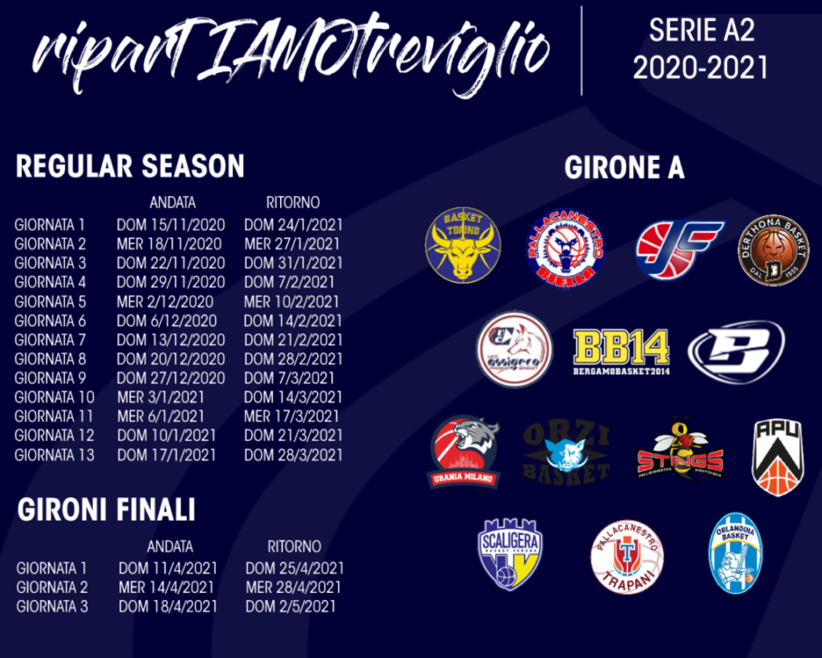 Il nuovo campionato della nuova serie A2 di pallacanestro, per le due bergamasche, Bergamo Basket 2014 e Blu Basket Treviglio, comincia il 15 novembre con una formula inedita. Conclusa la regular season il 28 marzo 2021, infatti, per stabilire le posizioni nelle griglie playoff e playout, le squadre del girone A (Ovest, quello che interessa la palla a spicchi made in BG) e del B (Est) verranno suddivise in ulteriori cinque raggruppamenti, C-D-E-F-G, in cui confluiranno in base al piazzamento.