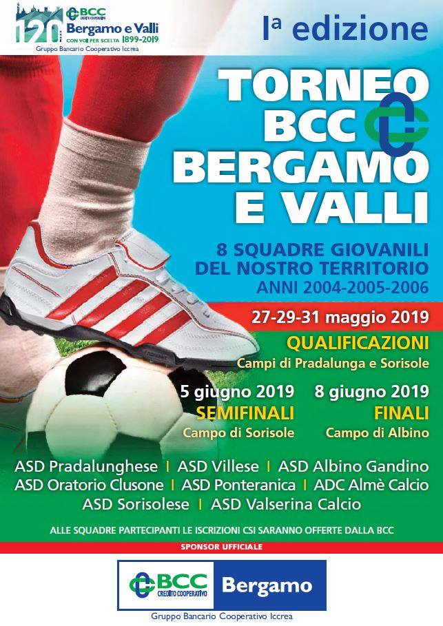 La Bcc Bergamo e Valli, nell’ambito delle iniziative per i suoi 120 anni di fondazione, organizza un torneo di calcio giovanile che vedrà coinvolte otto squadre i cui giocatori sono nati tra il 2004 e il 2006. Si tratta di ASD Pradalunghese, ASD Villese, ASD Albino Gandino, ASD Oratorio Clusone, ASD Ponteranica, ADC Almè Calcio, ASD Sorisolese e ASD Valserina Calcio. Tutte rappresentative di territori ove è presente e opera la Banca di Credito Cooperativo di Bergamo. Il primo “Torneo di calcio Bcc Bergamo e Valli 2019” si svolgerà nelle date del 27, 29 e 31 maggio in cui sono in programma le fasi di qualificazione alle finali. In queste date il torneo avrà luogo presso i campi di Pradalunga e Sorisole. Sempre il campo di Sorisole ospiterà le semifinali, che si svolgeranno il 5 giugno, mentre la finalissima si terrà ad Albino il prossimo 8 giugno.