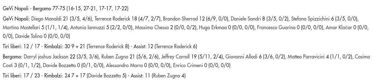 E dopo il pasticcio del piede sull’entrata di Jackson madama sfortuna è tornata a guardare i bergamaschi che con i soliti falli sistematici, e una serie di errori dalla lunetta dei giocatori napoletani, erano riusciti a subire un solo punto e ad avere a due secondi dalla fine la rimessa da centrocampo per il tiro del sorpasso: ma il tiraccio scagliato da Allodi è finito sul tabellone. Anche se la gara si era decisa sull’azione precedente.