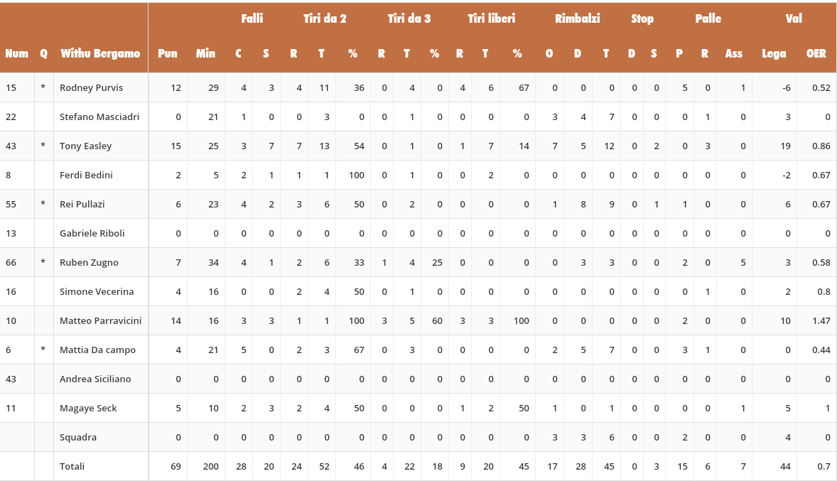 Gara equilibrata per trenta minuti, con Bergamo avanti all’intervallo 39-38 e al trentesimo per 59-57, ma nell’ultimo periodo la maggiore esperienza dei milanese ha pesato in maniera decisiva.