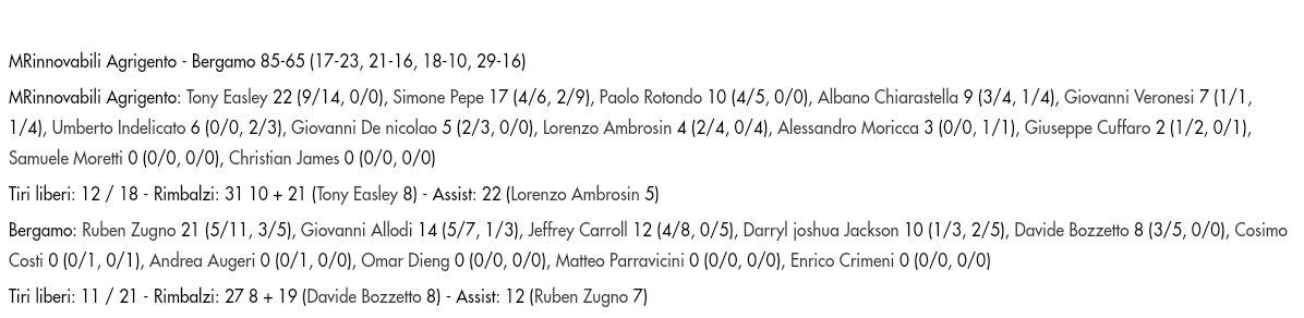 Impossibile vincere così, spremendo solo Allodi e Zugno. Ma questa era una partita che Bergamo avrebbe potuto fare sua, avanti 23-17 dopo nove minuti con palla in mano, avanti 36-33 dopo 17 minuti con Carroll in lunetta. Errori che hanno pesato, perché Agrigento, confusa in attacco senza James, si è aggrappata al solo Easley, mai tenuto da Bozzetto, e una volta ritrovata la vena balistica di Pepe ha letteralmente triturato il BB14, che dal 22’, sul 41-43, ha preso un’imbarcata da 44-22 in 18 minuti. Cosi è impossibile pensare ad una salvezza che ormai è un miraggio.