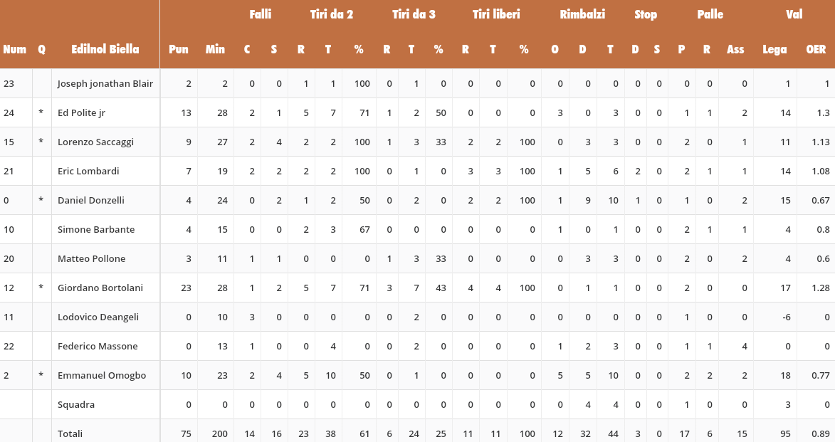 Senza Jeffrey Carroll, inutilizzabile per un infortunio al ginocchio — anche se gli esami specialistici hanno escluso lesioni, per cui dovrebbe recuperare in tempi brevi, forse già per la gara casalinga di sabato contro Trapani – e con il 18enne Parravicini in campo per oltre 25 minuti, come i 19enni Costi e Dieng, era impensabile andare a fare risultato sul parquet di Biella, formazione con ambizioni legittime di promozione.