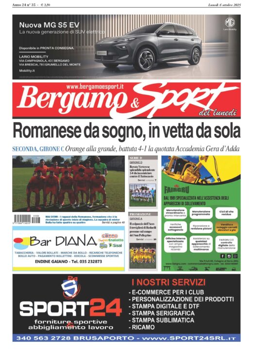Ecco la prima vera rivelazione della stagione calcistica bergamasca edizione 2025-2026. E’ la Romanese (Seconda C) di mister Bulla, squadra a cui dedichiamo la copertina del nostro settimanale, giornale che potete acquistare o dal vostro giornalaio di fiducia o tramite la nostra edicola digitale cliccando dalle sei di mattina su www.bergamoesport.it/abbonamenti). Orange stellari, poker all’Accademia Gera d’Adda e vetta solitaria del raggruppamento a punteggio pieno. Bene, anzi benissimo, tante altre nostre compagini, su tutte abbiamo scelto di metterne in evidenza altre due, la Rovato Vertovese (Serie D, Girone D), perfetta contro il Tuttocuoio, e l’Acos Treviglio (Promozione A), corsara a San Pellegrino.