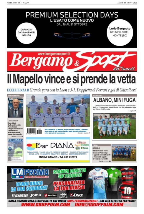 Super gara contro il malcapitato Leon con le giocate e i gol di due grandi del nostro calcio, Ferrari e Ghisalberti, e il Mapello si prende la vetta in solitaria. Bravi, anzi bravissimi, i ragazzi di Pandini, ora al comando del Girone B di Eccellenza, a cui dedichiamo il principale richiamo della prima pagina di Bergamo & Sport, settimanale che potete acquistare o dal vostro giornalaio di fiducia o tramite la nostra edicola digitale cliccando dalle sei di mattina su www.bergamoesport.it/abbonamenti. Applausi ai gialloblù isolani come a molte altre belle realtà del nostro pallone, tra le tante questa settimana abbiamo deciso di mettere in copertina anche il sorprendente Albano di mister Palmisano (vittoria sull’Immacolata Alzano e prima mini fuga in testa al Girone C di Seconda) e il Comun Nuovo di Alborghetti, squadra in forma strepitosa che è andata a vincere sul campo del Team Oratorio Pumenengo agganciandolo al secondo posto del Girone D di Prima. Tra le notizie che vi segnaliamo non può mancare la nostra bella intervista a Paolo Fiorini, presidente provinciale dei nostri arbitri, persona che stimiamo da sempre sia per la cortesia che per le molteplici iniziative fatte in questi anni, su tutte il doppio tesseramento e il reclutamento dei fischietti andando a raccontare il “mestiere” nelle nostre scuole superiori.