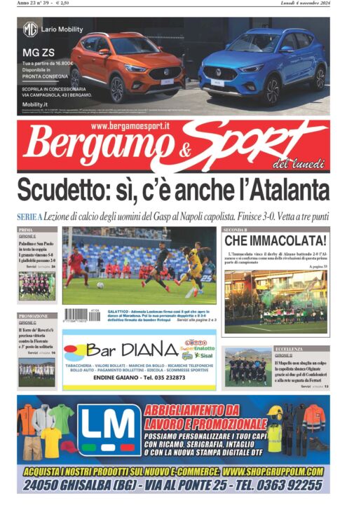 Una lezione di calcio impartita alla capolista, il Napoli di Conte, questo ci viene da scrivere sull’ultima grande partita dell’Atalanta di Gasperini, l’ennesima prestazione indimenticabile degli ultimi anni. Alla Dea, e non potevamo fare altrimenti, dedichiamo la prima pagina del numero odierno di Bergamo & Sport, settimanale che, come sempre, potete acquistare o dal vostro giornalaio di fiducia o tramite la nostra edicola digitale cliccando dalle sei di mattina su www.bergamoesport.it/abbonamenti. I nerazzurri sono tra i candidati alla vittoria dello scudetto 2024-2025? Mai come dopo il 3-0 di Napoli la nostra risposta è sì, anche per la crescita esponenziale fatta vedere da Lookman e compagni in questi mesi. Si vedrà. Restano negli occhi le prove offerte da una difesa perfetta e impenetrabile, da un centrocampo di lotta e di governo e da un attacco letale e ispiratissimo. Se ci aggiungiamo che in panchina c’è uno dei migliori mister oggi in Europa, che la rosa è profonda e che la società è presente e solida, siamo convinti che a Bergamo ci siano tutti gli elementi per sognare in grande. Non solo Atalanta sul nostro giornale, ovviamente, moltissime infatti sono le pagine che troverete sul calcio provinciale, con – in evidenza – le formazioni che stanno regalando emozioni e gioie ai loro tifosi. In copertina, quindi, pure l’Immacolata Alzano (Seconda B), che ha vinto il derbissimo con l’Alzanese, poi il Mapello (Eccellenza B), che sta letteralmente dominando il proprio campionato, il Paladina e il San Paolo d’Argon, che stanno dando spettacolo (Prima E), e il Torre de’ Roveri (Promozione C), al terzo posto solitario dopo aver vinto e convinto contro l’ostica Fiorente. Che altro? Tantissime le partite seguite sui campi della Bergamasca dai nostri cronisti e tantissimi gli approfondimenti su qualsiasi categoria, dalla Serie C alla Terza Categoria. Ci siamo, non ci resta che congedarci con il consueto consiglio: non importa dove, non importa quando, ma comperate Bergamo & Sport.