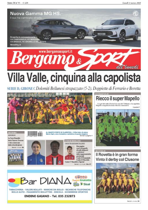 Ecco a voi una brevissima presentazione del numero odierno di Bergamo & Sport, il settimanale dei calciatori della nostra provincia, pubblicazione che potete acquistare o dal vostro giornalaio di fiducia o tramite la nostra edicola digitale cliccando dalle sei di mattina su www.bergamoesport.it/abbonamenti. In evidenza, e qui ci ripetiamo, il Villa Valle, vera e propria rivelazione della stagione di Serie D, in grado questa domenica di rifilare la bellezza di cinque reti alla corazzata del Girone C, il Dolomiti Bellunesi. Applausi ai giallorossi, ai dirigenti, come allo staff tecnico, come ai giocatori, ora al quarto posto in classifica, in piena zona play-off. Bene, anzi benissimo, anche il Mapello (Eccellenza B), in testa al proprio raggruppamento e reduce da tre successi consecutivi, l’ultimo in casa della Tritium firmato da bomber Ferrari, fuoriclasse eterno del nostro movimento dilettantistico. In Seconda B volano la Nova Montello e il Rovetta, formazioni che stanno vivendo un momento magico e che in questo fine settimana hanno vinto rispettivamente con Aurora Trescore e Città di Clusone. Tanti gli approfondimenti, su tutti quello sulle nostre rappresentative giovanili, due pagine con tutte le foto dei ragazzi dell’Under 15 Maschile, delle ragazze dell’Under 15 Femminile, dei ragazzi dell’Under 17 Maschile e della squadra Special. Che altro? Il solito consiglio: non importa dove, non importa come e non importa quando, ma comperate Bergamo & Sport.
