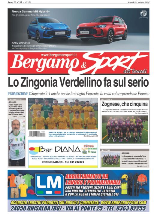 Lo Zingonia Verdellino (Promozione C), la Zognese (Seconda A) e la Nova Montello (Seconda B) vincono, convincono e sono in vetta ai rispettivi campionati. Agli uomini delle tre squadre bergamasche, partiti alla grande in questo avvio di stagione, dedichiamo la prima pagina del numero odierno di Bergamo & Sport, settimanale che, come sempre, potete acquistare o dal vostro giornalaio di fiducia o tramite la nostra edicola digitale cliccando dalle sei di mattina su www.bergamoesport.it/abbonamenti. Non solo le capoliste, tantissime le partite seguite dai nostri validi giornalisti e le belle storie di calcio che vi raccontiamo sul nostro giornale. Su tutte vi segnaliamo quella che ci ha più colpito, Ivan Claris, fenomenale asso del passato, ora preparatore dei portieri ad Almé (Promozione C), a 57 anni non ha esitato neppure un minuto quando il suo mister, Locatelli, lo ha convocato per la delicata sfida col Cenate Sotto. L’ex numero uno di parecchie favole orobiche si è rimesso i suoi magici guanti e si seduto in panchina, pronto all’occorrenza a subentrare al titolare, cosa che non è accaduta. Resta il coraggio e i nostri applausi a un signore del nostro pallone. Moltissimissimo fubal provinciale, come detto e come sempre, e parecchi approfondimenti, innanzitutto quello sulla Padre & Figlio, che ha chiuso l’annata del ciclismo dei Giovanissimi, quello sui nostri mitici Over 40, quello sul bel successo dell’Atalanta a Venezia e quello sul Volley Bergamo. Che altri dirvi? Il solito consiglio: non importa dove, non importa quando, ma comperate Bg & Sport!!!