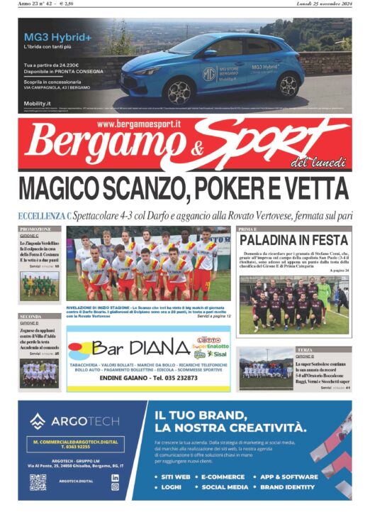 Che Scanzo, signore e signori… I giallorossi continuano il loro momento magico, battono 4-3 il Darfo Boario e conquistano la vetta del Girone C di Eccellenza a pari punti con la Rovato Vertovese, fermata sul pari dalla Castellana. Alla squadra di mister Delpiano, grande rivelazione di questa prima parte di stagione, dedichiamo la prima pagina del numero odierno di Bergamo & Sport, settimanale che, come sempre, potete acquistare o dal vostro giornalaio di fiducia o tramite la nostra edicola digitale cliccando dalle sei di mattina su www.bergamoesport.it/abbonamenti. Restiamo sul tema ed ecco le formazioni bergamasche che stanno brindando per i successi di questa domenica. Parliamo dello Zingonia Verdellino, 2-1 sul difficile campo della Forza & Costanza e testa del Girone C di Promozione ad appena due punticini dopo il mezzo passo falso del Pianico. Poi il Paladina (Prima E) e la Zognese (Seconda A), entrambi vincenti nelle sfide chiave con le battistrada dei rispettivi campionati, rispettivamente San Paolo e Villa d’Adda. Quindi la Sorisolese (Terza B), 5-0 interno da urlo con l’Oratorio Boccaleone e primo posto saldamente nelle mani. Ricordandovi i tantissimi nostri approfondimenti, quelli sull’Atalanta, sul calcio Over 40, sul Premio Angiolino Quarenghi (andato a Rodolfo Tavana), sul volley e su una StraOsio da record (1600 partecipanti), vi auguriamo una bellissima settimana dandovi il solito consiglio: non importa dove, non importa quando, ma comperate Bergamo & Sport!!!