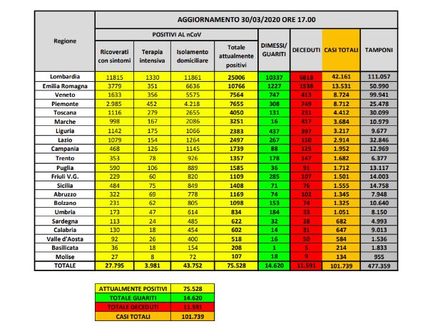 Bollettino nazionale del 30 marzo, il totale delle persone attualmente positive ammonta a 75528 persone (+1648 l’aumento al netto di decessi e guariti rispetto al dato di domenica, +4050 l’aumento lordo). Di questi, 3981 sono ricoverati in terapia intensiva, 27795 sono ricoverati con sintomi e 43752 sono in isolamento domiciliare, senza sintomi o con sintomi lievi. Sono stati 812 i decessi registrati nell’ultima giornata (totale 11591), mentre il dato complessivo dei guariti ammonta a 14620 (+1590 rispetto a domenica, dato più alto dall’inizio dell’epidemia). Il numero totale delle persone contagiate dall’inizio dell’epidemia ammonta a 101739. Sono 6550 le persone denunciate domenica per aver violato l’obbligo di quarantena (tra queste anche persone positive al virus).