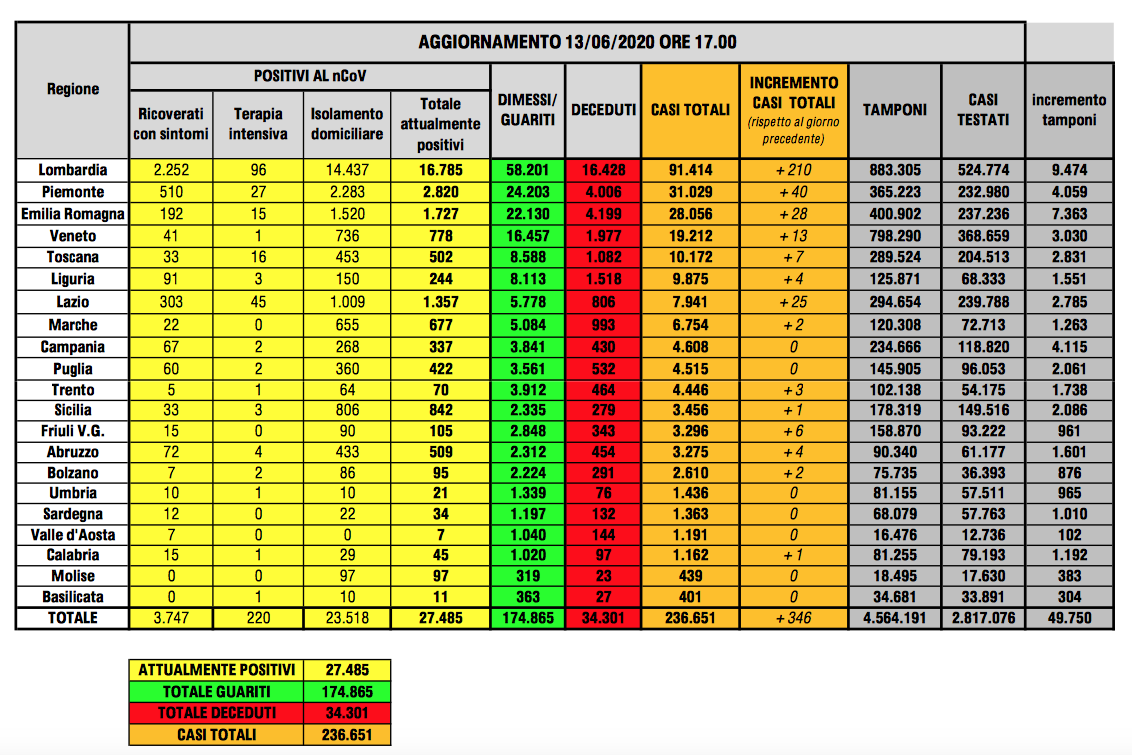 Bollettino nazionale del 13 giugno, il totale delle persone che hanno contratto il virus è di 236.651, con un incremento rispetto a ieri di 346 nuovi casi.
