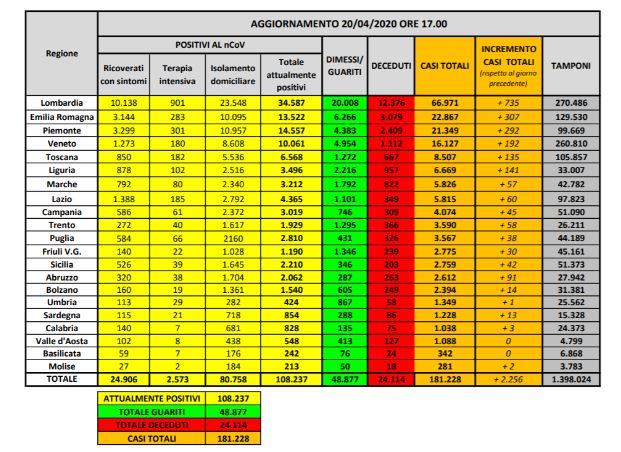 Bollettino nazionale del 20 aprile, sono 108237 le persone attualmente positive in Italia (con un aumento di 2256 unità rispetto a ieri). Nelle ultime 24 ore si registrano 454 decessi (24114 il totale). Dall’inizio dell’epidemia sono 181228 le persone colpite da Covid-19 in Italia. Nelle ultime 24 ore sono guarite 1822 persone (48877 il totale). Calano i pazienti in strutture ospedaliere (-127), cala l’utilizzo di terapie intensive (-62).
